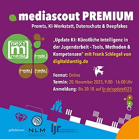 Der mediascout PREMIUM findet am 20.11.2025 von 9:00 bis 16:00 Uhr online statt. Die Anmeldung ist hier möglich: www.ljr.de/updateki25